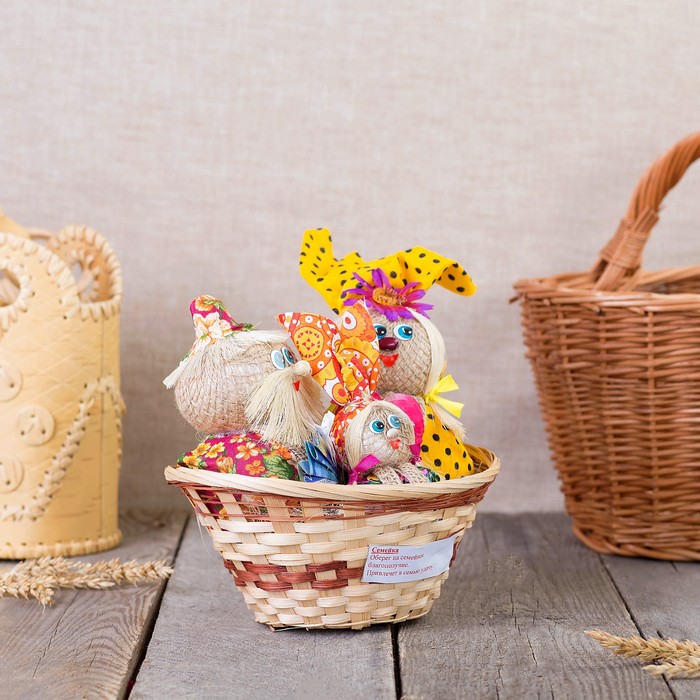 Оберег «Семейка», в круглой корзинке, микс — сувенир в полном смысле этого слова. И главная его задача — хранить воспоминание о месте, где вы побывали, или о том человеке, который подарил данный предмет. Преподнесите эту вещь своему другу, и она станет достойным украшением его дома.
