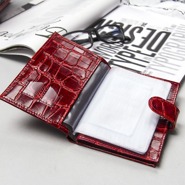 Обложка для автодокументов и паспорта на кнопке, отдел для купюр, 5 отделов для карт, красный скат
