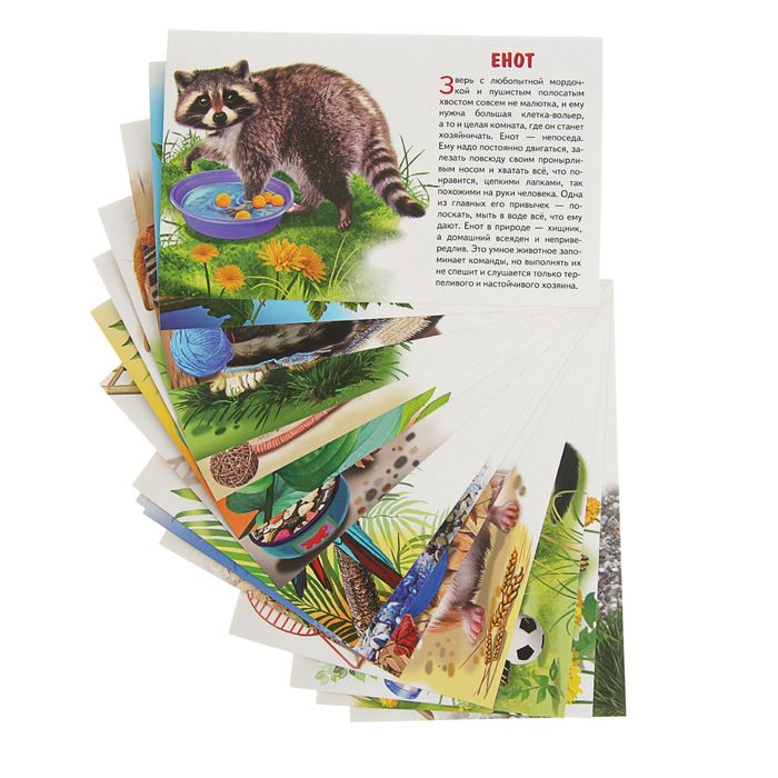 Развивающие карточки знакомят детей дошкольного и младшего школьного возраста с окружающим миром. Первые комплекты посвящены домашним и диким животным, распространённым в нашей стране, а также обитающим в разной среде на всех континентах. Кроме изображения животных карточки содержат общие сведения о них и отличительные черты их поведения. Размер карточек 120*190 мм.