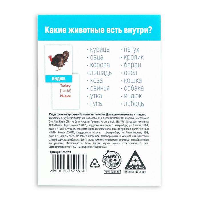 Каждый набор имеет свою особенность. С карточками «Домашние животные и птицы» ребята познакомятся с внешним видом одомашненных животных, а также изучат их названия на двух языках: русском и английском.