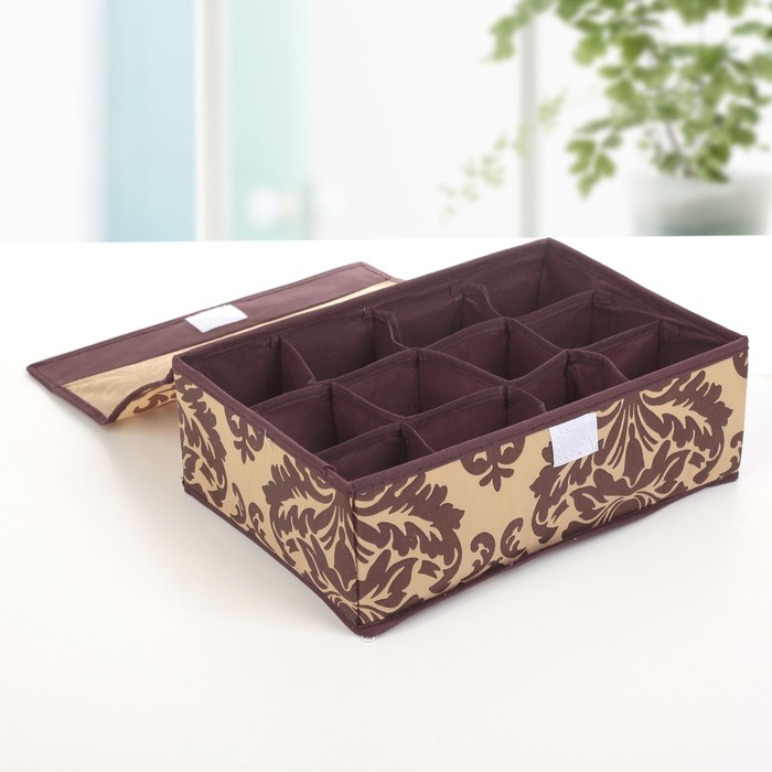 Органайзер для белья с крышкой, 12 отделений, 30х20х10 см "Вензель", цвет коричнево-бежевый