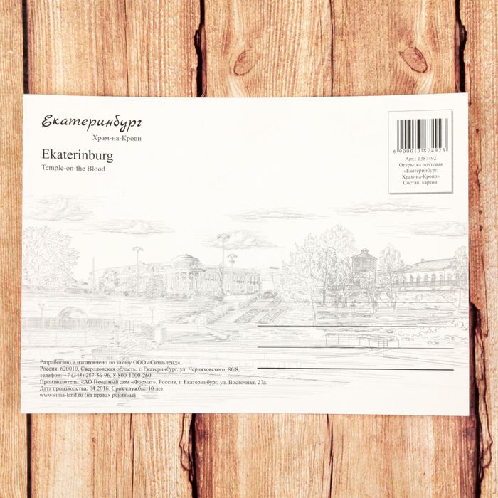 На открытке изображён символ города — величественный Храм-на-Крови, возведённый на месте, где в ночь 16 на 17 июля 1918 года был расстрелян последний российский император Николай II и его семья. В наши дни в храм съезжаются паломники со всей России, а также туристы из разных стран. Строительство храма началось в 2000 году. На освящение храма прибыл Патриарх Алексий II.