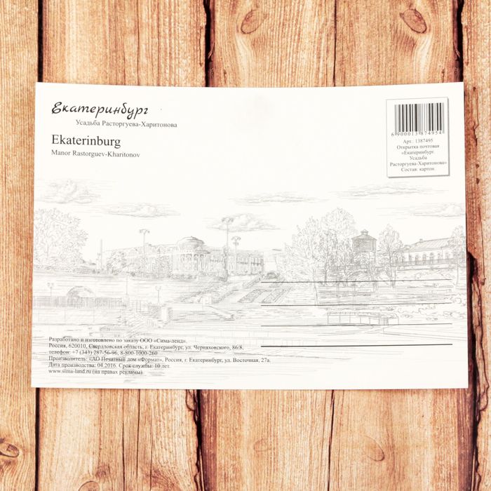 На открытке изображена Усадьба Расторгуевых ― Харитоновых, один из наиболее известных архитектурных ансамблей Екатеринбурга, памятник федерального значения. Она расположена на улице К. Либкнехта, в центре города, на Вознесенской горке. Здание построено в характерном для начала XIX века стиле классицизм. У асимметричного архитектурного комплекса главное строение смещено на юг, парк же разбит позади построек, на его территории вырыто озеро с островком и ротондой. В парке произрастают вековые лиственницы и липы — старейшие деревья Екатеринбурга.