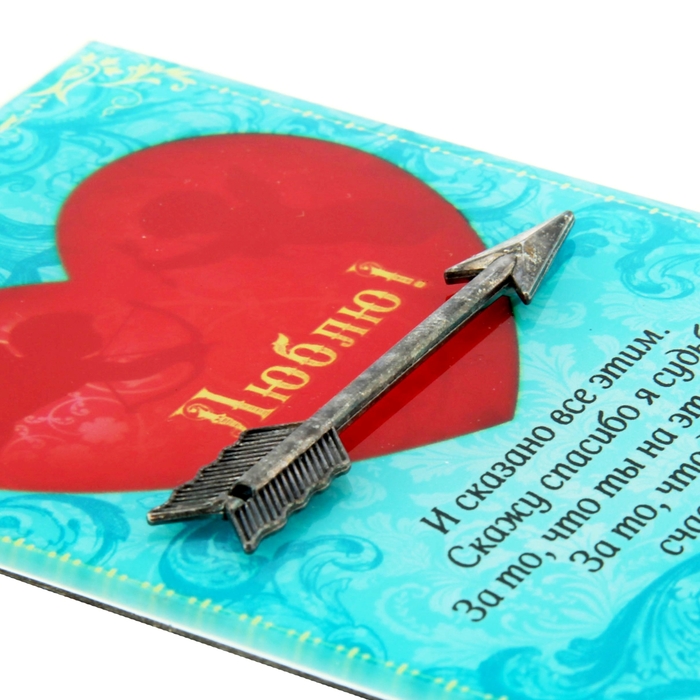 Открытка сделана из стекла с оригинальным принтом и украшена декоративным металлическим элементом в виде стрелы как бы пронзающей большое алое сердце. Она расскажет о ваших чувствах, заставит сердце любимого человека биться чаще и будет напоминать о вас при каждом взгляде. Она преподносится в подарочной упаковке с эксклюзивным дизайном и теплыми словами. Станет прекрасным дополнением к подарку или самостоятельным презентом.
