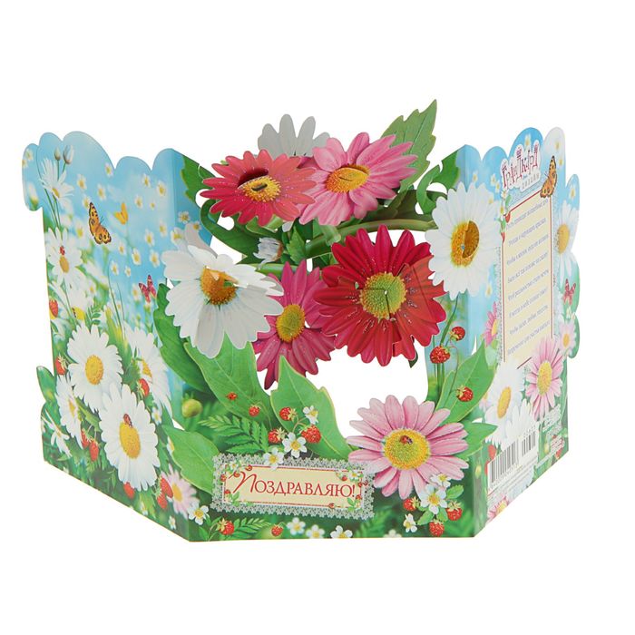 Выразить свои чувства и дополнить основной подарок тёплыми словами вам поможет Открытка сложно-техническая "Поздравляю!" трехмерная, герберы, А5. С ней ваше пожелание «Счастья, любви и здоровья» приобретёт трепетный и душевный подтекст. А воспоминания о праздничном дне ещё долго будут радовать адресата.