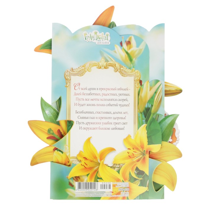 Выразить свои чувства и дополнить основной подарок тёплыми словами вам поможет Открытка сложно-техническая "С Юбилеем! 55" лилии, А4. С ней ваше пожелание «Счастья, любви и здоровья» приобретёт трепетный и душевный подтекст. А воспоминания о праздничном дне ещё долго будут радовать адресата.