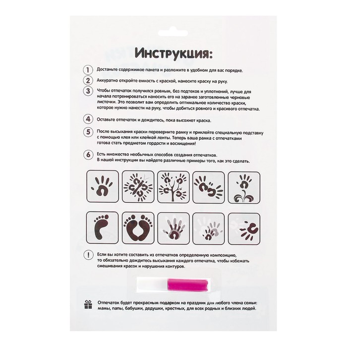 Сохранить воспоминания о детстве поможет этот набор для создания отпечатка. Сделать такую милую композицию очень просто: пусть малыш приложит раскрашенную ладошку в поле рамки, и первый шедевр вашего ребёнка готов! Более подробную инструкцию, а также варианты интересного оформления вы найдёте на обложке изделия.