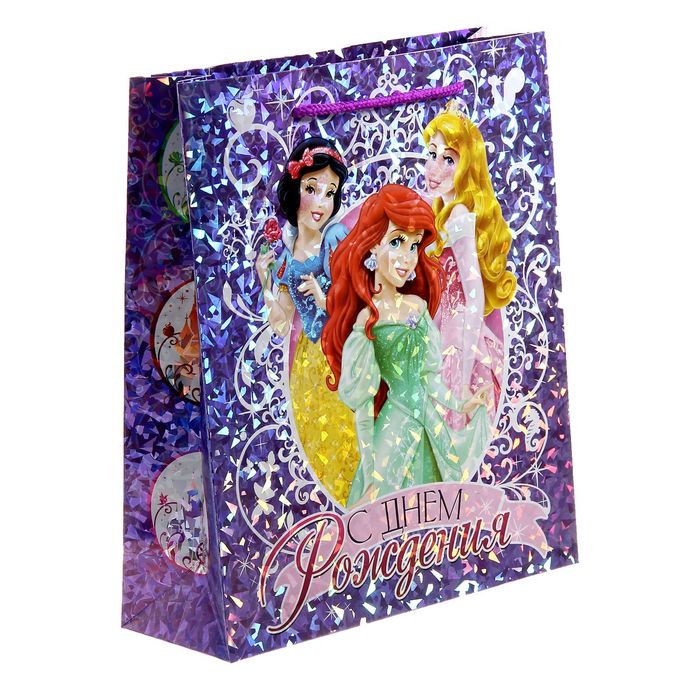 Пакет голография вертикальный "С днем рождения!", Принцессы, 23 х 27 см