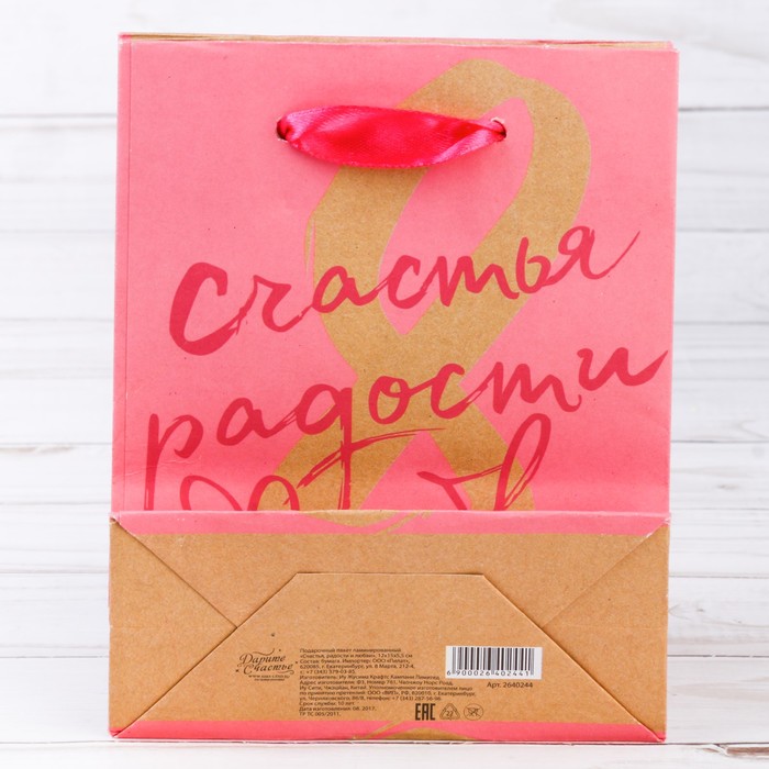 Любой подарок начинается с упаковки. Что может быть трогательнее и волшебнее, чем ритуал разворачивания полученного презента. И именно оригинальная, со вкусом выбранная упаковка выделит ваш подарок из массы других. Она продемонстрирует самые тёплые чувства к виновнику торжества и создаст сказочную атмосферу праздника. Пакет крафтовый вертикальный «Счастья Радости и Любви», 12 × 15 × 6 см — это то, что вы искали.