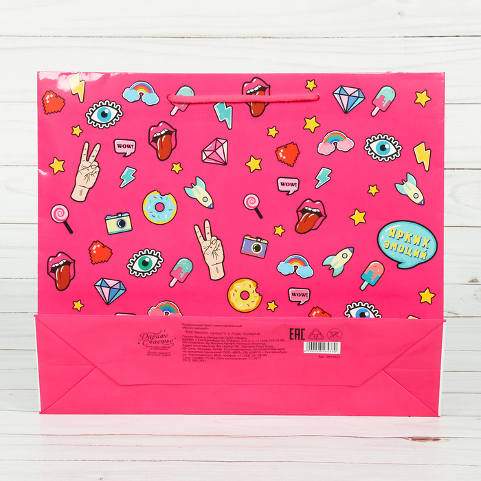 Любой подарок начинается с упаковки. Что может быть трогательнее и волшебнее, чем ритуал разворачивания полученного презента. И именно оригинальная, со вкусом выбранная упаковка выделит ваш подарок из массы других. Она продемонстрирует самые тёплые чувства к виновнику торжества и создаст сказочную атмосферу праздника. Пакет ламинированный вертикальный «Ярких эмоций!», ML 23 × 27 × 11,5 см — это то, что вы искали.