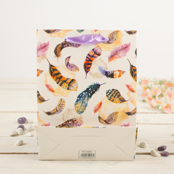 Пакет подарочный "Пёрышки", бежевый, 18 х 8 х 24 см