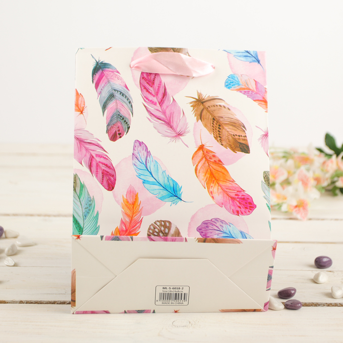 Пакет подарочный "Пёрышки", розовый, 18 х 8 х 24 см