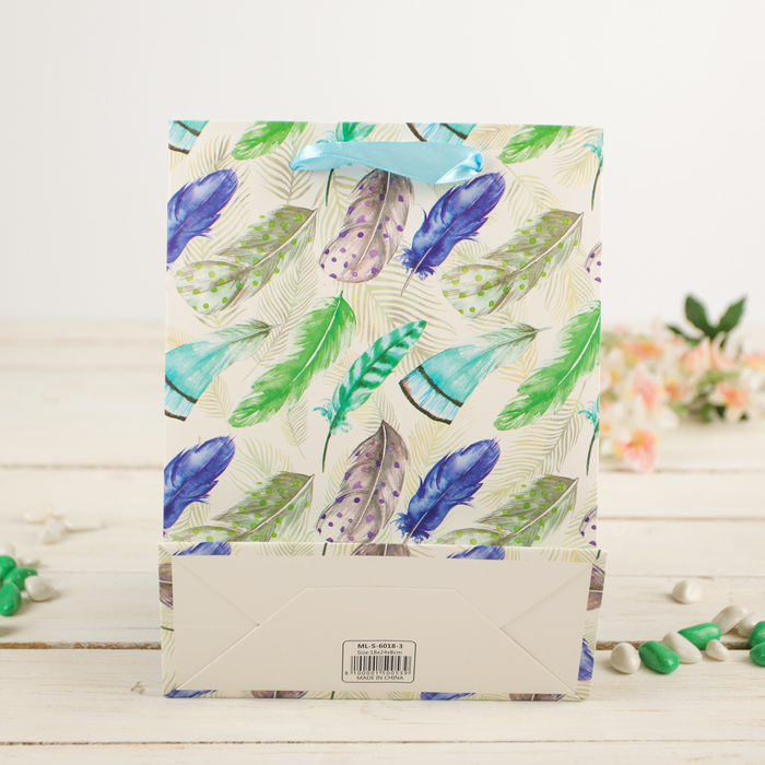 Пакет подарочный "Пёрышки", зелёный, 18 х 8 х 24 см
