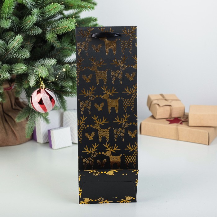 Пакет подарочный под бутылку "Новогодние олени", 12 х 8 х 35 см