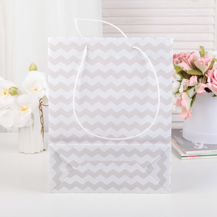 Пакет подарочный с бантом, "Зигзаг", дымчато-белый, 35 х 27 х 12 см