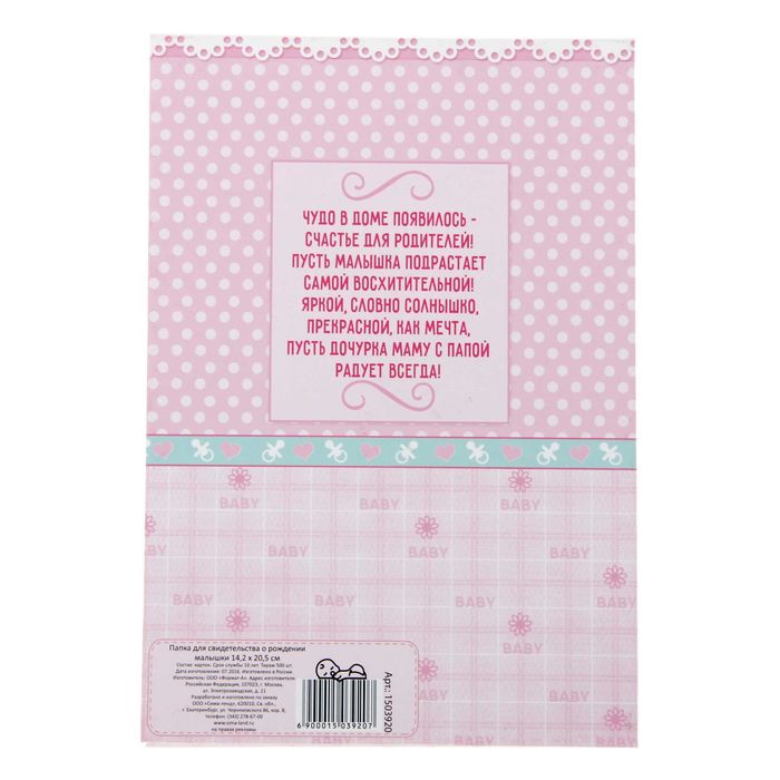 Папка под свидетельство о рождении формата А5 имеет удобный файл внутри, который защитит первый в жизни документ малышки от повреждений. Внутри неё расположено место под фото и строки для записей «Первых моментов счастья». Эксклюзивный дизайн и душевные пожелания делают папку прекрасным подарком в этот волшебный день.