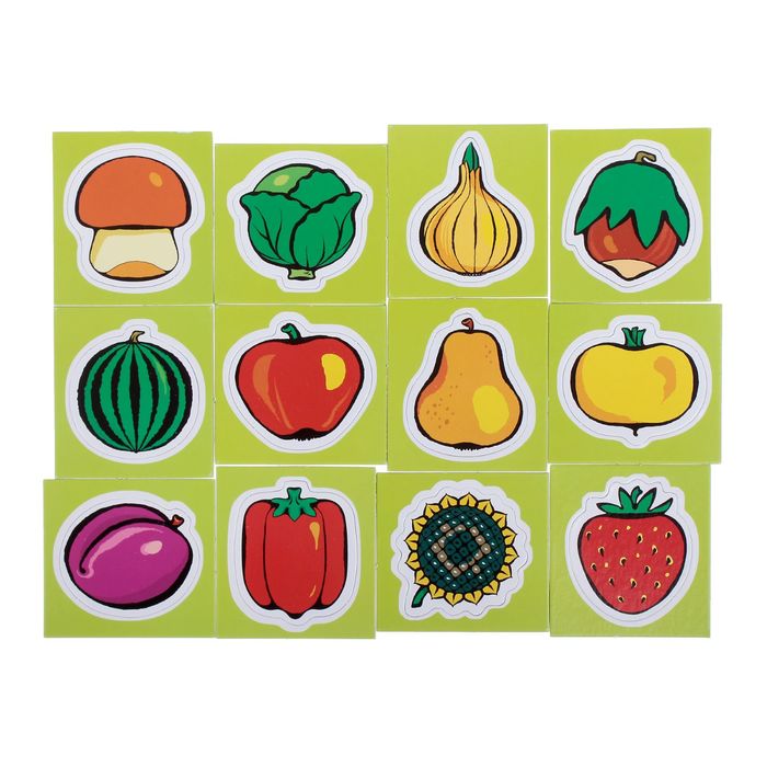 Игра познакомит ребёнка с овощами, фруктами, грибами, ягодами. Набор с карточками развивает зрительное восприятие, логическое и образное мышление, мелкую моторику.