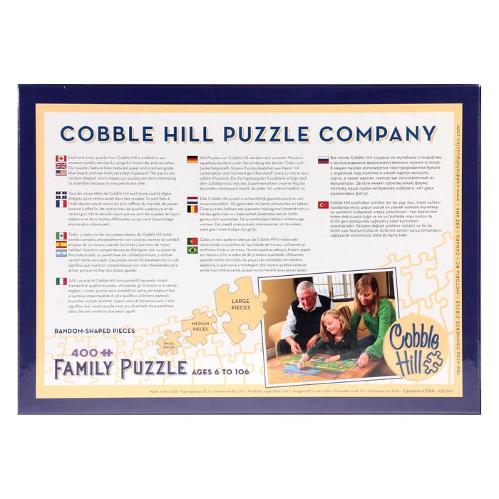 Рисунок создан с использованием высококачественных чернил и лаков. Элементы выполнены из текстурированной бумаги с отделкой под полотно и прочного картона из макулатуры. Во время сборки невозможно соединить неподходящие детали: они имеют уникальную форму и пазловый замок. Игра из элементов трёх типоразмеров предназначена для составления всей семьёй.