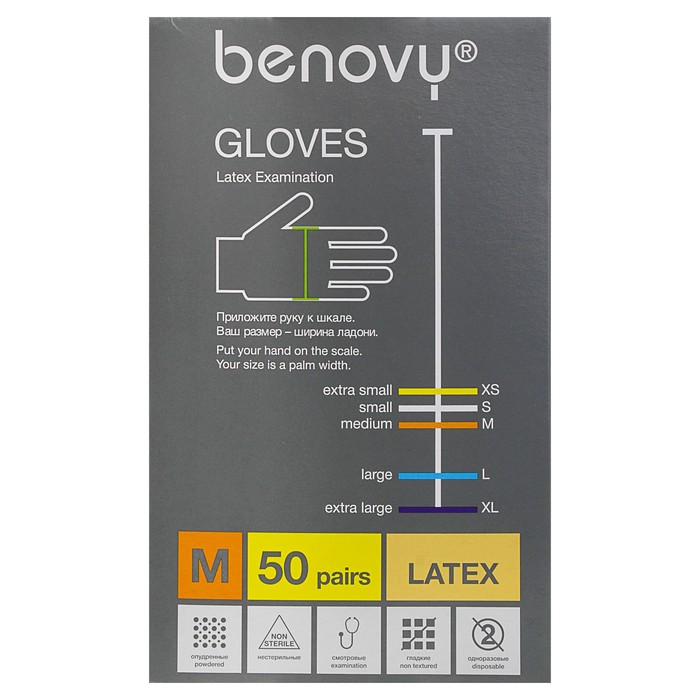Перчатки латексные опудренные гладкие Benovy M, 50 пар/100 шт — это изделия, которые обеспечивают безопасность в лечебно-профилактических учреждениях.