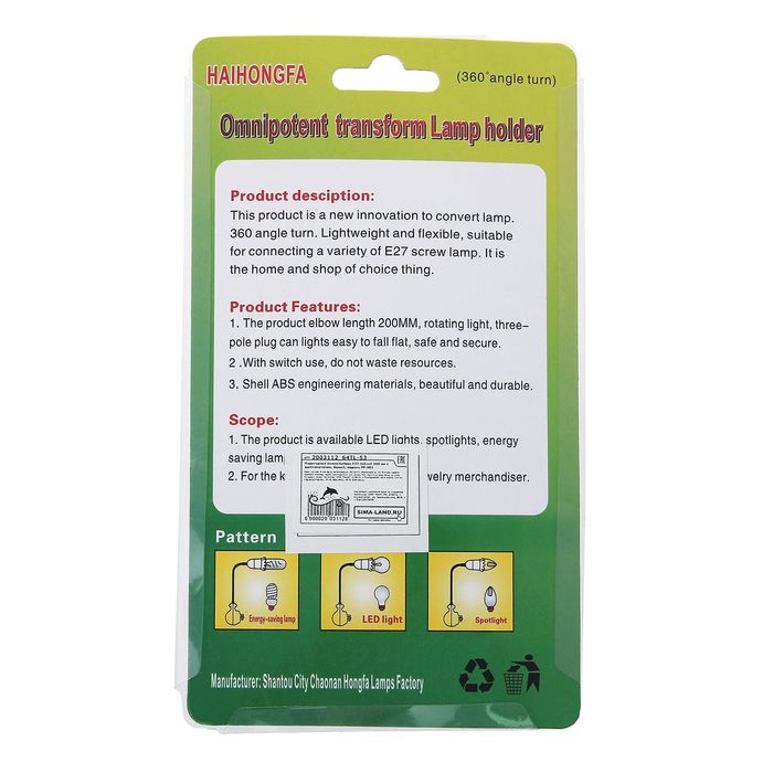 Переходник предназначен для изготовления дополнительного осветительного прибора без монтажных работ. Пригодится во время ремонта или в затемнённой рабочей зоне. Вставьте любую лампу с подходящим цоколем в патрон и подключите приспособление к сети. Гибкий шнур позволяет направить поток света в нужное место.
