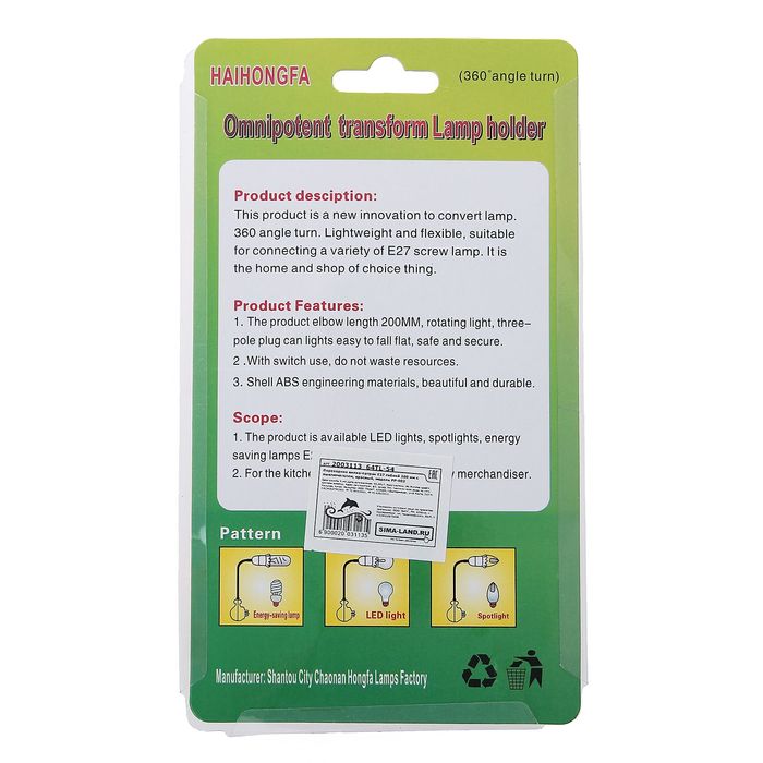 Переходник предназначен для изготовления дополнительного осветительного прибора без монтажных работ. Пригодится во время ремонта или в затемнённой рабочей зоне. Вставьте любую лампу с подходящим цоколем в патрон и подключите приспособление к сети. Гибкий шнур позволяет направить поток света в нужное место.