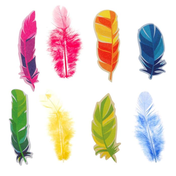 В набор входят 3 натуральных и 5 бумажных пёрышек.