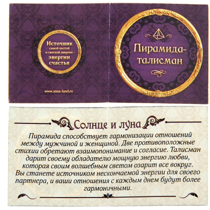 Пирамидка «Солнце и луна» способствует гармонизации отношений между мужчиной и женщиной. Если вы хотите наладить общение со своей второй половинкой, пирамидка будет благотворно влиять на ваше взаимопонимание на энергетическом уровне. Талисман дарит своему обладателю мощную энергию любви, которая своим волшебным светом озарит все вокруг. Вы станете источником нескончаемой энергии для своего партнера, и ваши отношения с каждым днем будут более гармоничными.