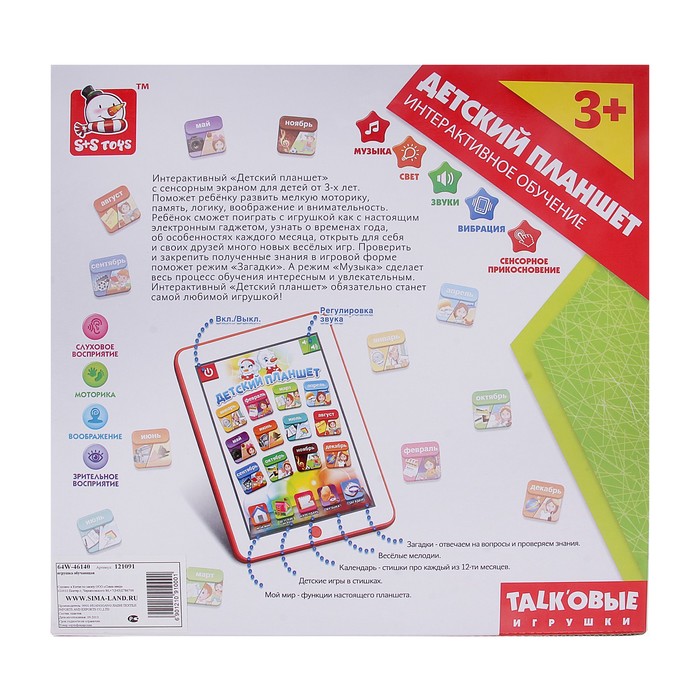 Ребёнок сможет поиграть с игрушкой как с настоящим электронным гаджетом, узнать о временах года, об особенностях каждого месяца, открыть для себя и друзей много новых веселых игр. Проверить и закрепить полученные знания в игровой форме поможет режим "Загадки". А режим "Музыка" сделает весь процесс обучения интересным и увлекательным. Предназначен для детей от 3 лет.
