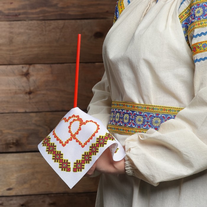 Рушник изготовлен из ткани и украшен ярким орнаментом.