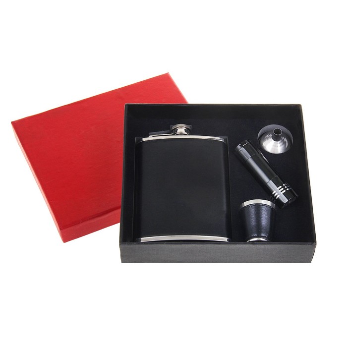 Подарочный набор 3 в 1 "Стиль": фляжка 240 мл + рюмка в коже, воронка и фонарик (9 диодов) — сувенир в полном смысле этого слова. И главная его задача — хранить воспоминание о месте, где вы побывали, или о том человеке, который подарил данный предмет. Преподнесите эту вещь своему другу, и она станет достойным украшением его дома.
