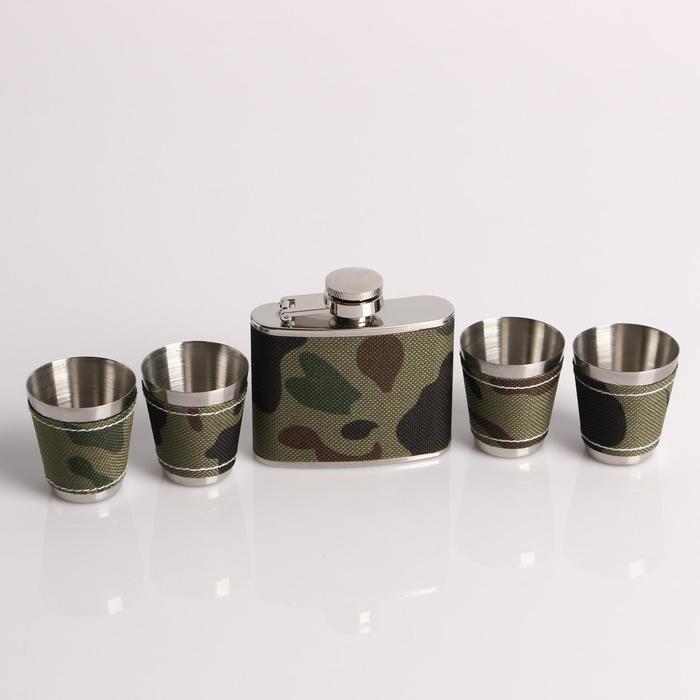 Подарочный набор 5 в 1 "Хаки" в упаковке ПВХ: фляжка 60 мл + 4 рюмки