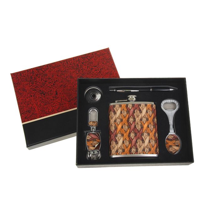 Подарочный набор 5 в 1 "Плетение": фляжка 210 мл + брелок, воронка, ручка, открывалка яркий пример того как должен выглядеть настоящий подарок для близкого человека или бизнес-партнера. Спешите, заказывайте подарки в преддверии приближающихся праздников уже сейчас по отличным оптовым ценам.