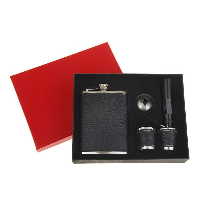 Подарочный набор 5 в 1 "Рептилия": фляжка 240 мл + воронка, 2 рюмки в коже, фонарик — сувенир в полном смысле этого слова. И главная его задача — хранить воспоминание о месте, где вы побывали, или о том человеке, который подарил данный предмет. Преподнесите эту вещь своему другу, и она станет достойным украшением его дома.