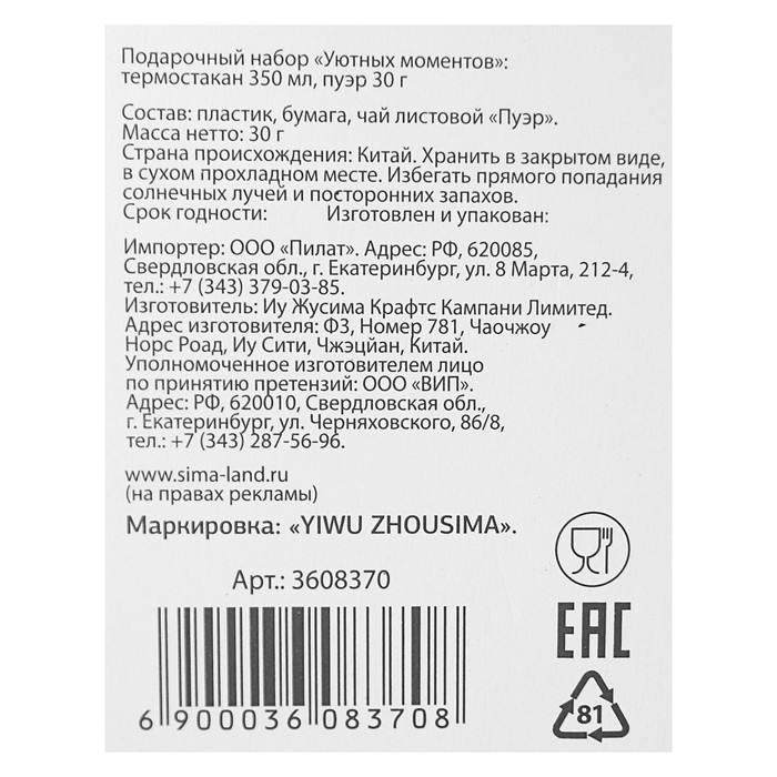 Подарочный набор "Уютных моментов", термостакан 350 мл, пуэр 30 гр