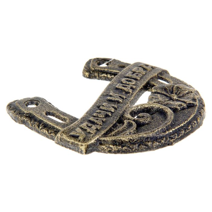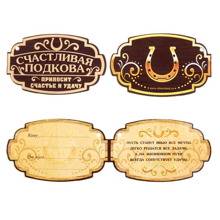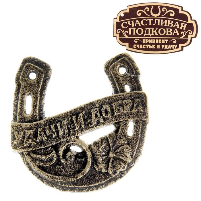 Металлическую подкову украшает замысловатый орнамент. К сувениру прилагается шильд, где можно написать тёплые слова и пожелания. На рожках сувенира предусмотрены два отверстия, в которые можно продеть ленту и повесить оберег над дверью или в любом удобном место.