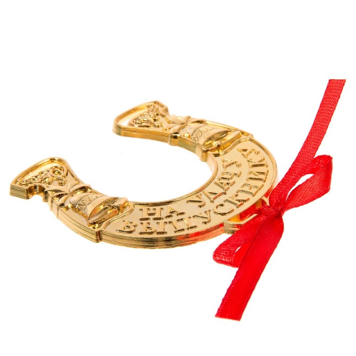 Подкова выполнена из металла под золото, дополнена красным атласным бантиком. Сувенир преподносится на эксклюзивной открытке с теплыми пожеланиями и напутствиями выпускнику.
