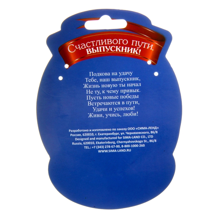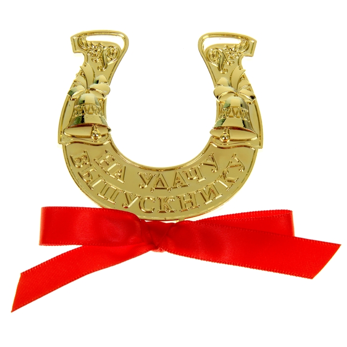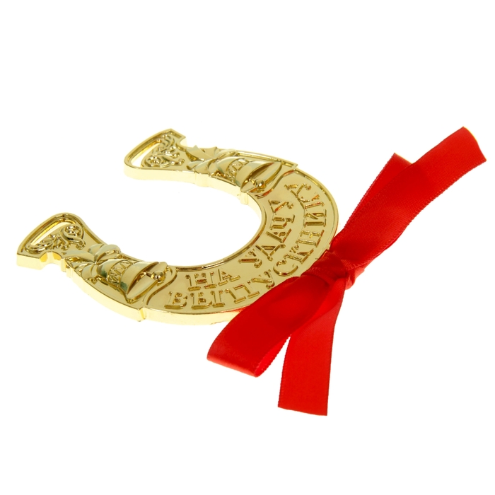Подкова выполнена из металла под золото, дополнена красным атласным бантиком. Сувенир преподносится на эксклюзивной открытке с теплыми пожеланиями и напутствиями выпускнику.