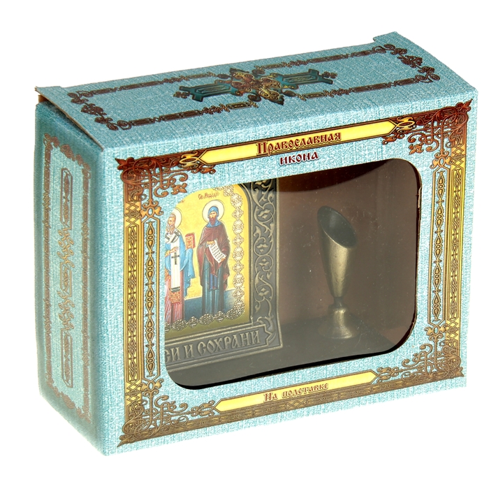 Подставка для ручки с иконой "Просветители славян Кирилл и Мефодий" - состоит из деревянной основы к которой прикреплена металлическая рамка с изящным орнаментом. Икона, которая вклеена внутри рамки, полностью соответсвует канонам Православной Церкви. Рядом с рамкой на деревянной подставке находится место для ручки или карандаша. Упакована в оригинальную коробку с PVC окном. Такая подставка для ручки относится к VIP сувенирам, выглядит богато и будет прекрасным подарком подчеркивающим духовность дарителя и получателя.