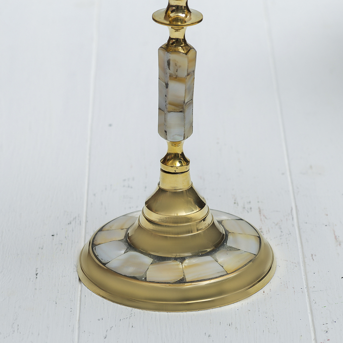 Индийские мастера знают, как работать с латунью, ведь они с древности создают различные изделия из этого металла. Например, изысканный подсвечник на 3 свечи "Кардинал" с перламутровыми вставками поражает своими грациозными линиями, изысканным декором и перламутровыми вставками из экзотических материалов. В сумраке этот полезный предмет поможет Вам придержать свечу в своих крепких объятиях, а на свету его изумительный блеск будет переливаться и играть в лучах солнца. Великолепный аксессуар, который украсит Ваш интерьер и станет актуальным подарком на «Медную свадьбу» или любой другой праздник.