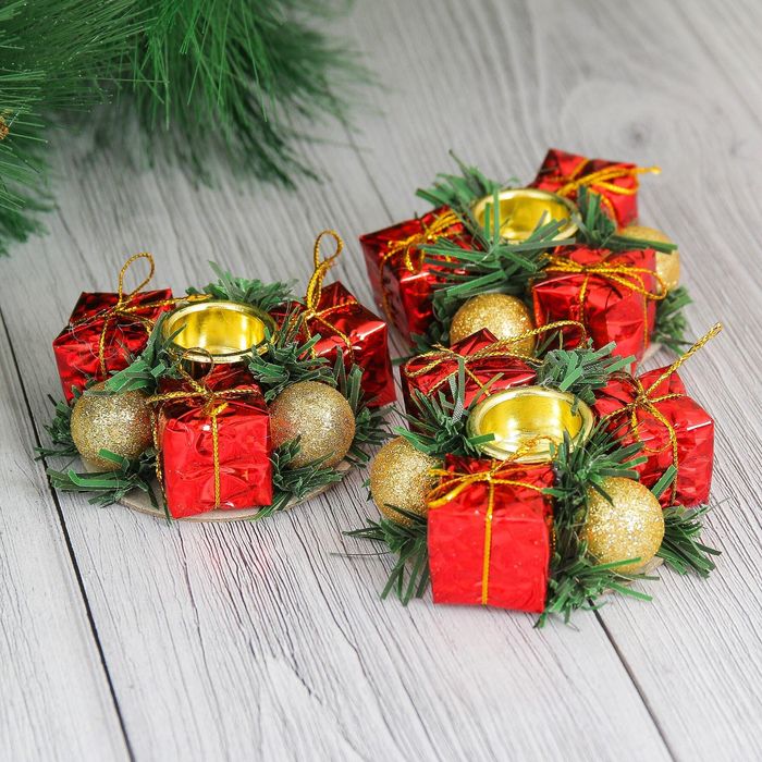 Невозможно представить нашу жизнь без праздников! Мы всегда ждём их и предвкушаем, обдумываем, как проведём памятный день, тщательно выбираем подарки и аксессуары, ведь именно они создают и поддерживают торжественный настрой. Подсвечник новогодний "Шарики и подарки" на одну свечу (набор 3 шт) d-7 см — это отличный выбор, который привнесёт атмосферу праздника в ваш дом!