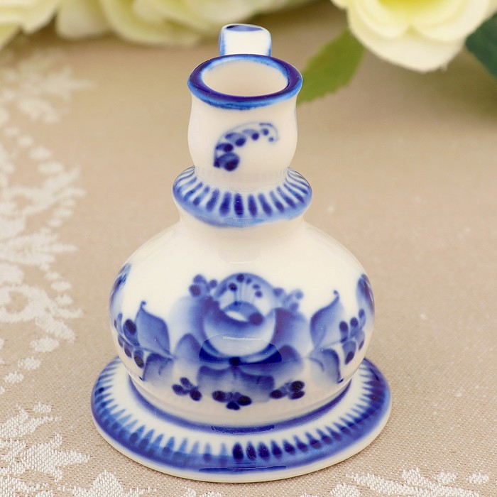 Подсвечник с ручкой, гжель, фарфор, автор Дубровина, h=7 см