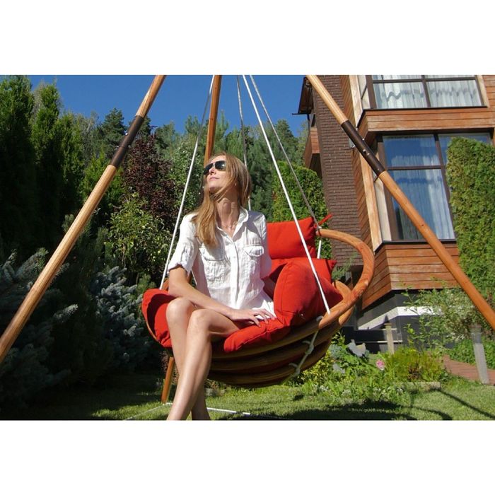 Такие качели для отдыха не займут много места. Установите их на террасе, в саду или на лоджии. Если у вас нет возможности подвесить конструкцию к потолку, тогда выручит специальный каркас. Надёжный корпус и прочные крепления обеспечивают безопасность, а мягкое сиденье позволит расслабиться. В этом кресле можно уединиться с книгой или просто насладиться свободной минутой.
