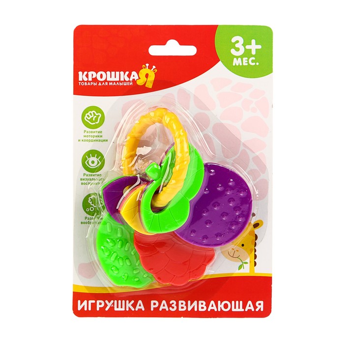 Звук в модели появляется при встряхивании. Причудливая форма надолго займёт внимание карапуза. Погремушку удобно использовать: лёгкая вещица подходит для захвата маленькими ладошками.
