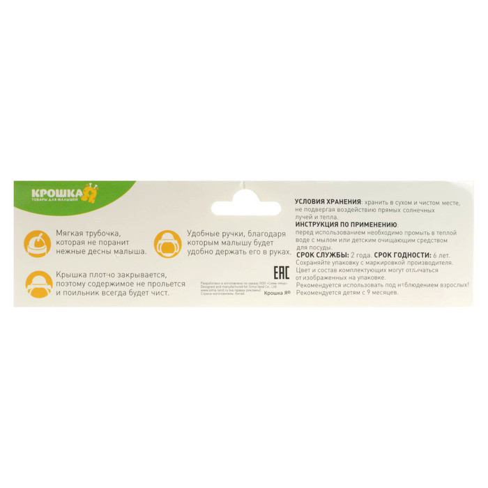 Качество товара подтверждается сертификатом соответствия ЕАС. Поильник выполнен из безопасного пластика, предназначенного для производства детской посуды.