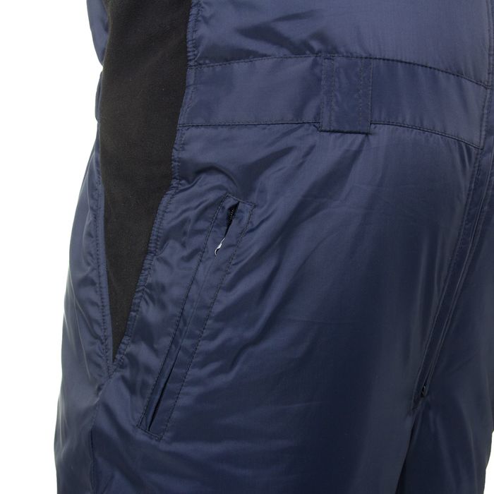 На полукомбинезоне три внешних кармана, в области колена расположен карман для защитных вкладышей, молния на двух замках, пояс регулируется эластичной тесьмой, есть шлёвки под ремень.