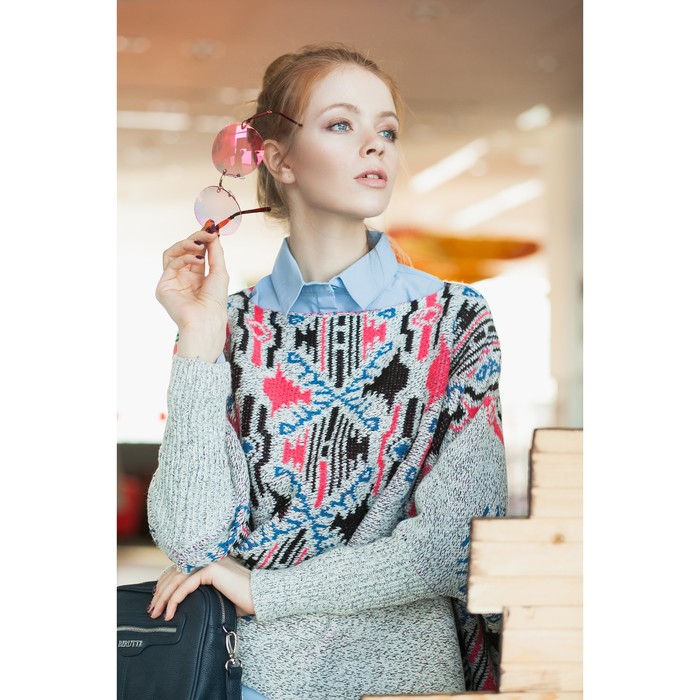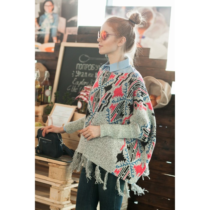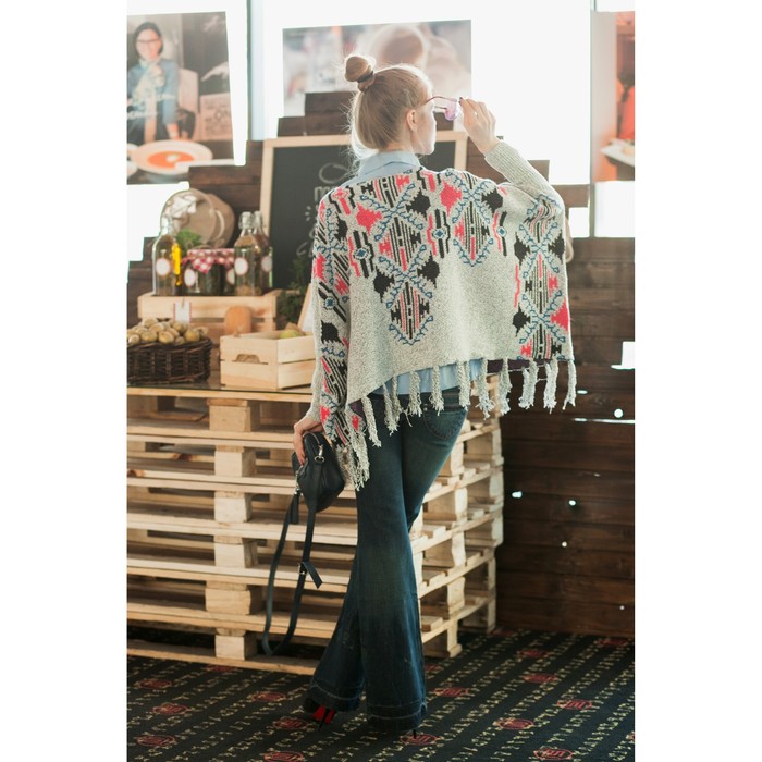 Пончо с рукавами защитит от холода. Чтобы утеплиться ещё больше, под низ можно надеть однотонную рубашку. В сочетании с джинсами образ получается молодёжным и неформальным, а в тандеме с ботфортами или сапогами — более женственным и уютным.