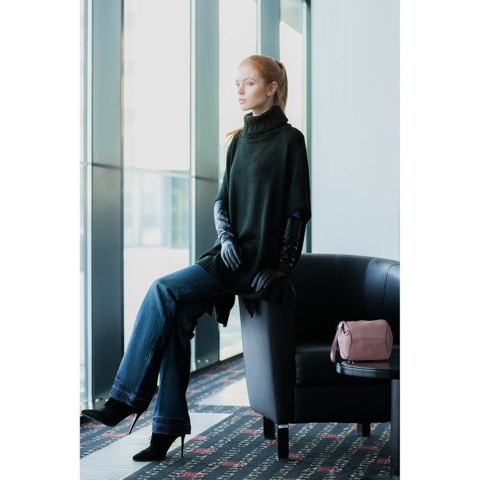 Модель хорошо смотрится и с джинсами, и с брюками классического покроя. В тандеме с пончо ботфорты или сапоги сделают образ уютным.