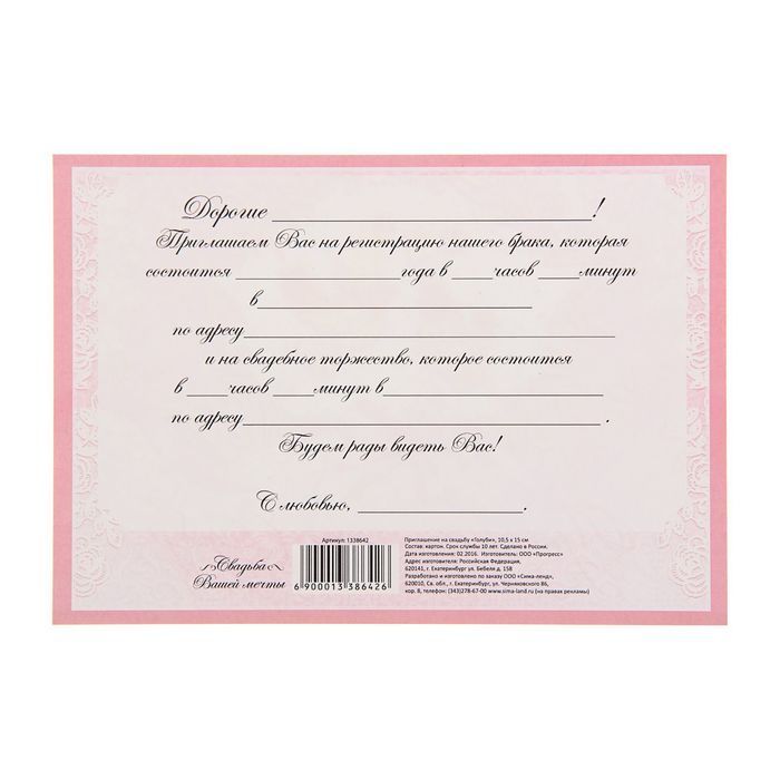Приглашение на свадьбу выполнено в форме открытки (10,5 х 15 см), на обратной стороне которой расположен текст со свободными полями для имени адресата, времени, даты и адреса проведения мероприятия. Мы продумали все детали, вам остаётся только заполнить необходимые строки и раздать приглашения гостям.