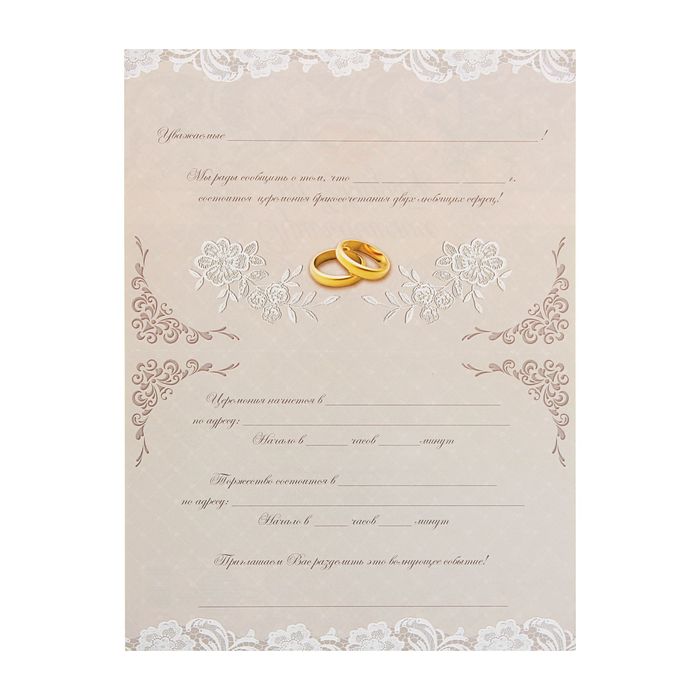 Приглашение на свадьбу выполнено в форме открытки (18 х 12 см), на обратной стороне которой расположен текст со свободными полями для имени адресата, времени, даты и адреса проведения мероприятия. Мы продумали все детали, вам остаётся только заполнить необходимые строки и раздать приглашения гостям.