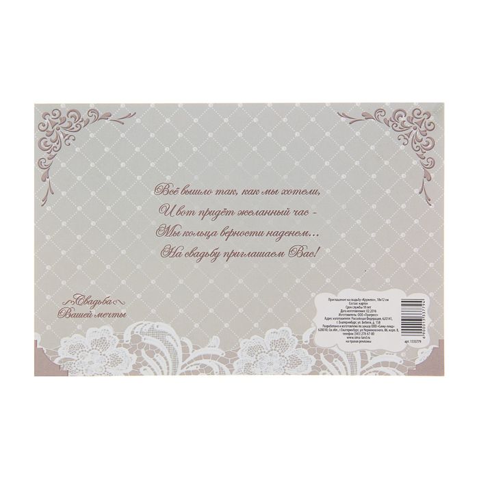 Приглашение на свадьбу «Кружево», 18 х 12 см